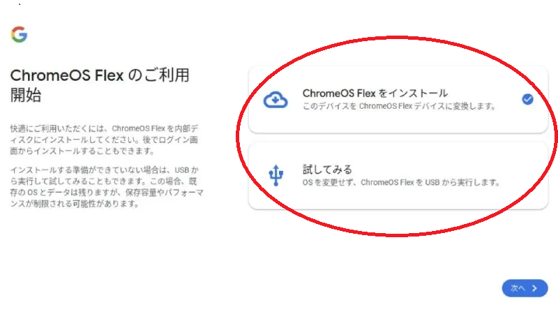 「ChromeOS Flexをインストール」を選択すれば