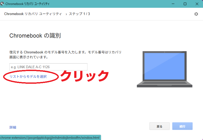 Chromebookの識別という画面になるので「リストからモデルを選択」をクリックします。
